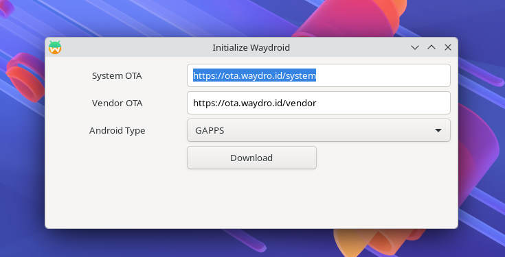 Boot VM, open waydroid, select GApps variant and hit download. Depending on your machine the waydroid container could take a while to start, be patient and don't spam the button.